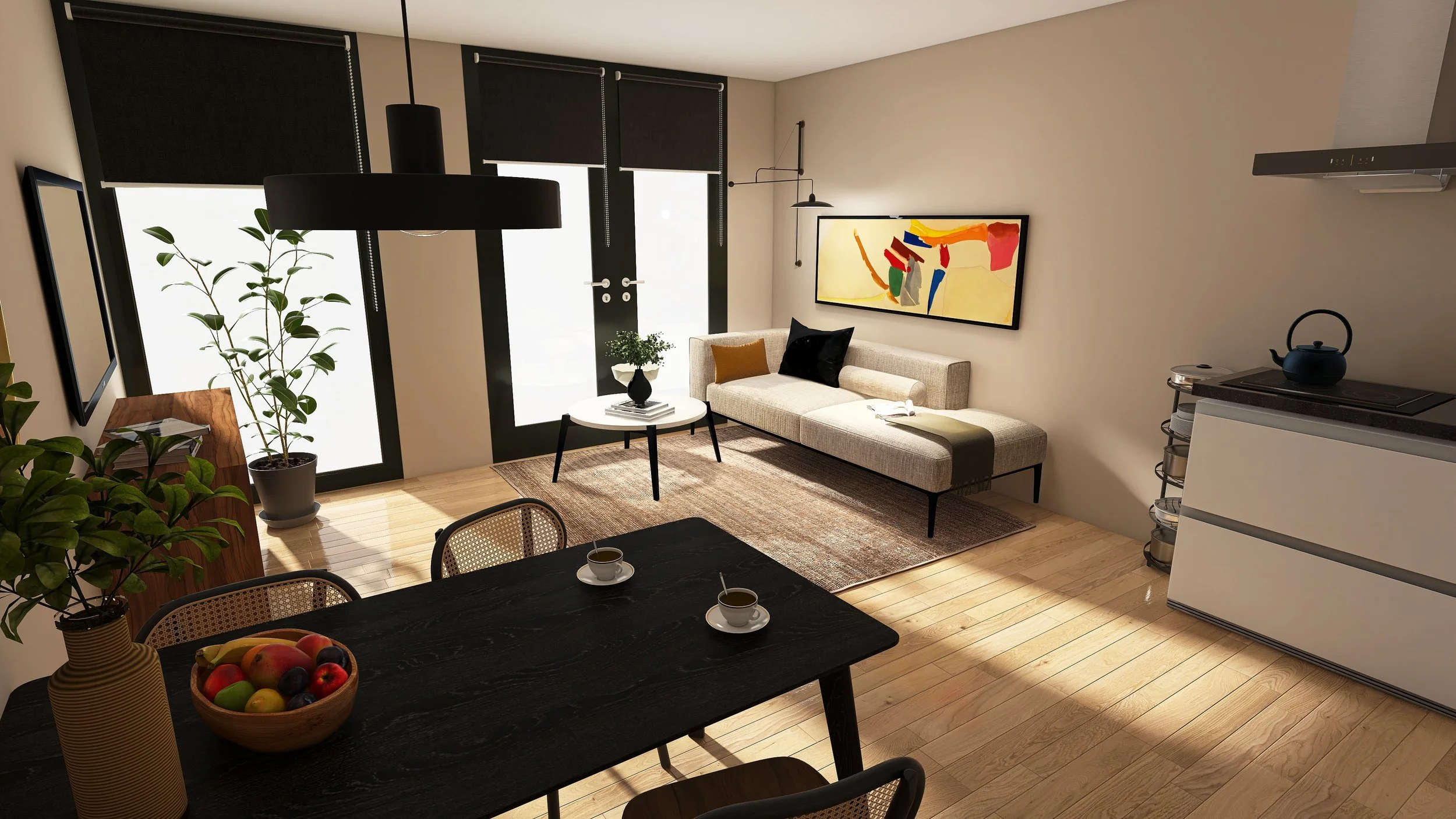 Let op: de plattegrond van dit appartement is gespiegeld. De plattegrond en de sfeerbeelden zijn ter illustratie en hier kunnen geen rechten aan worden ontleend.