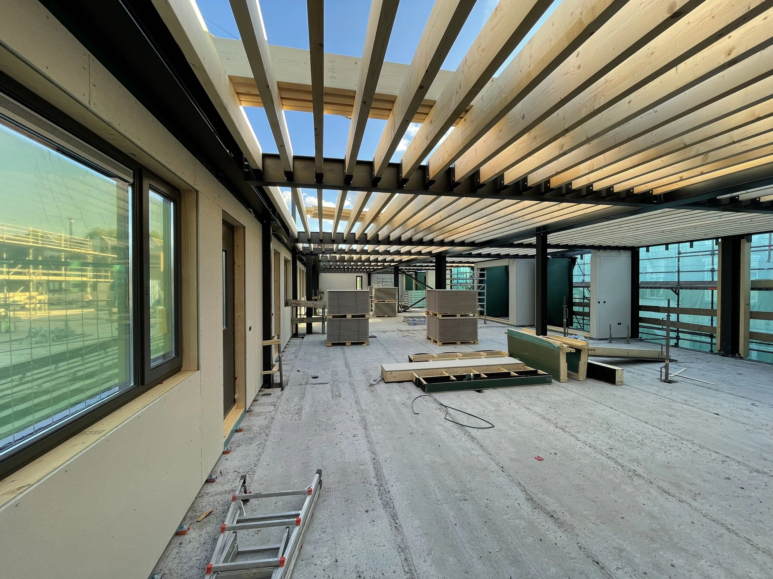 De appartementen op de eerste verdieping die worden opgebouwd uit houten elementen.