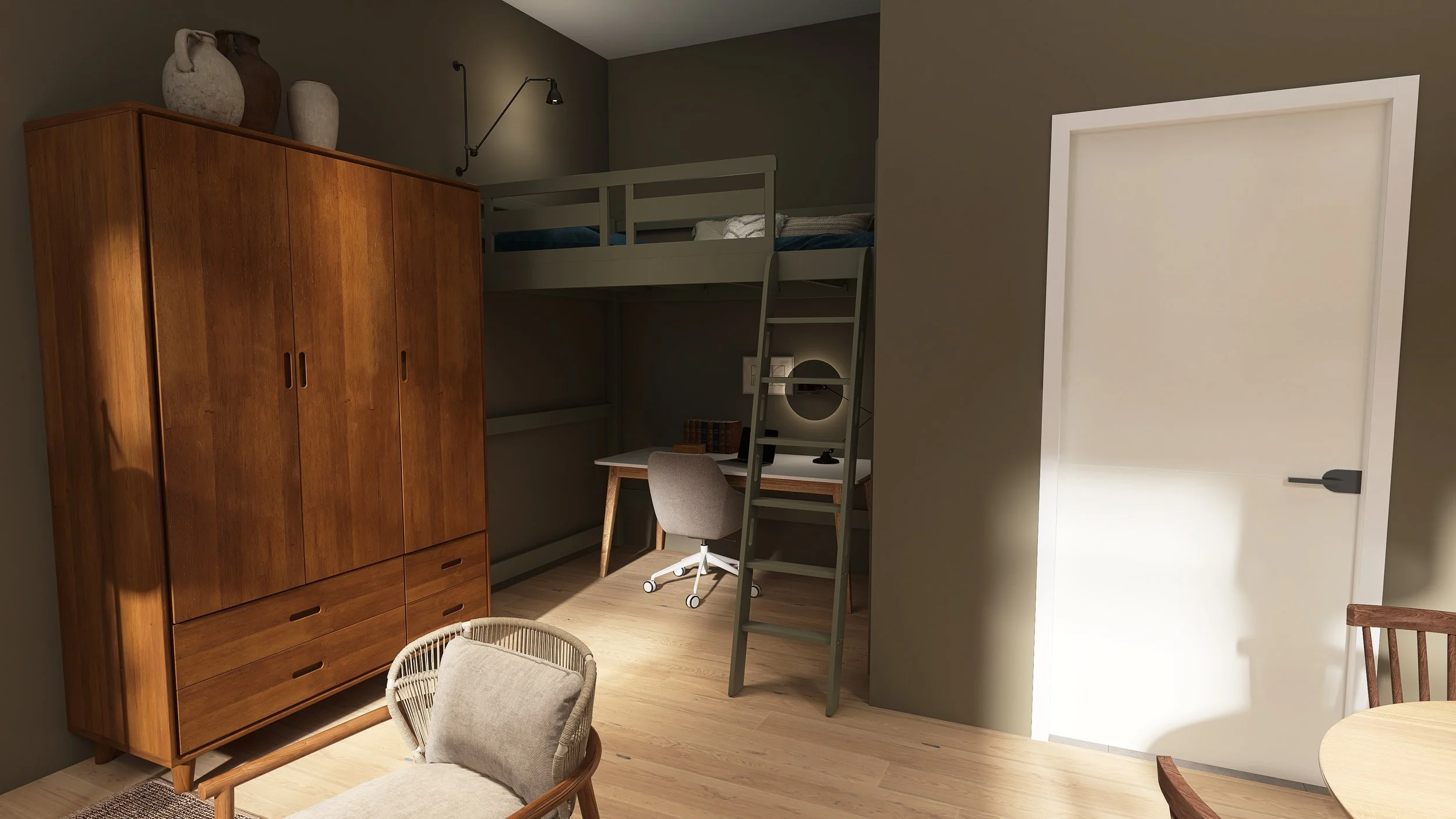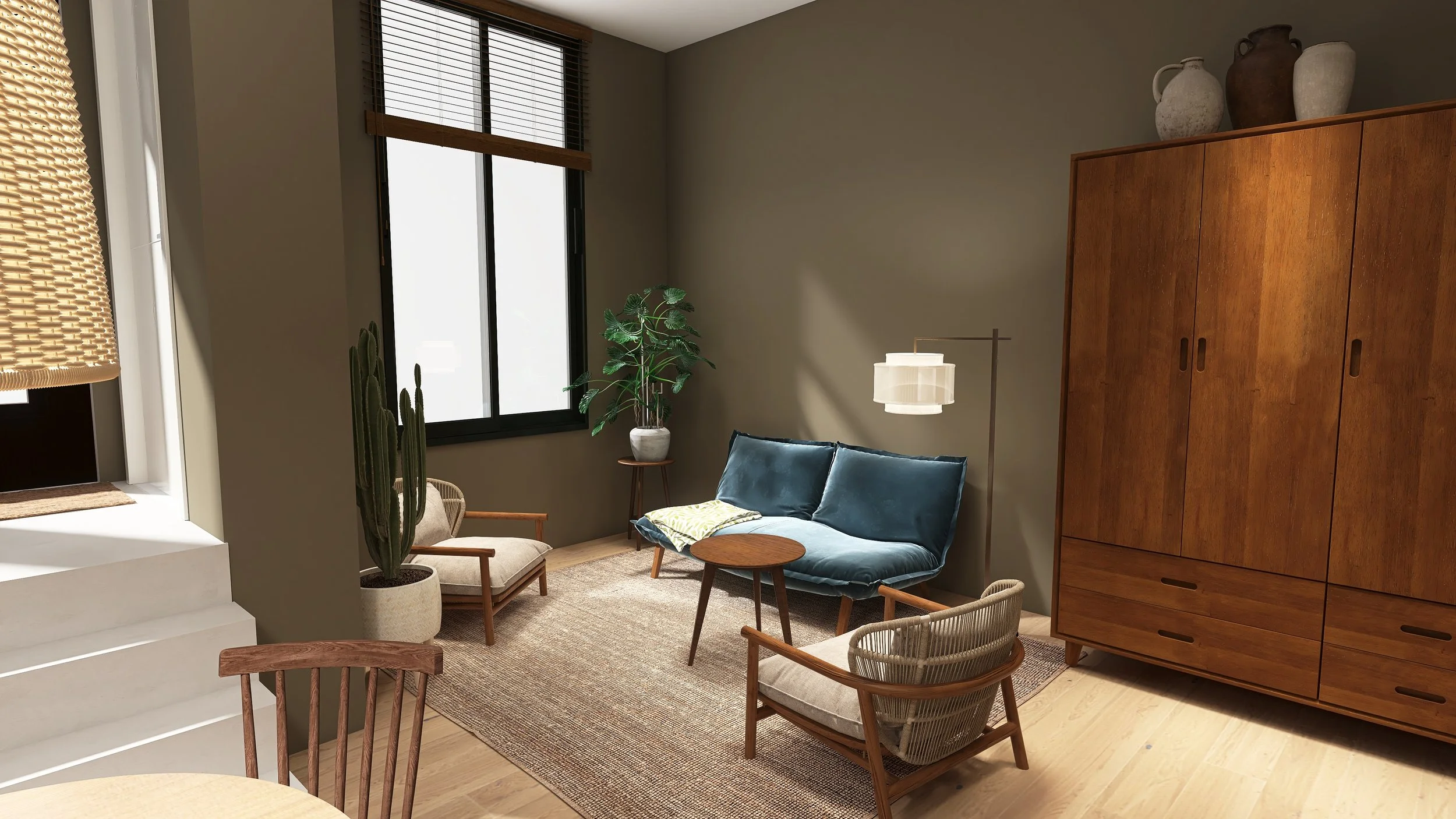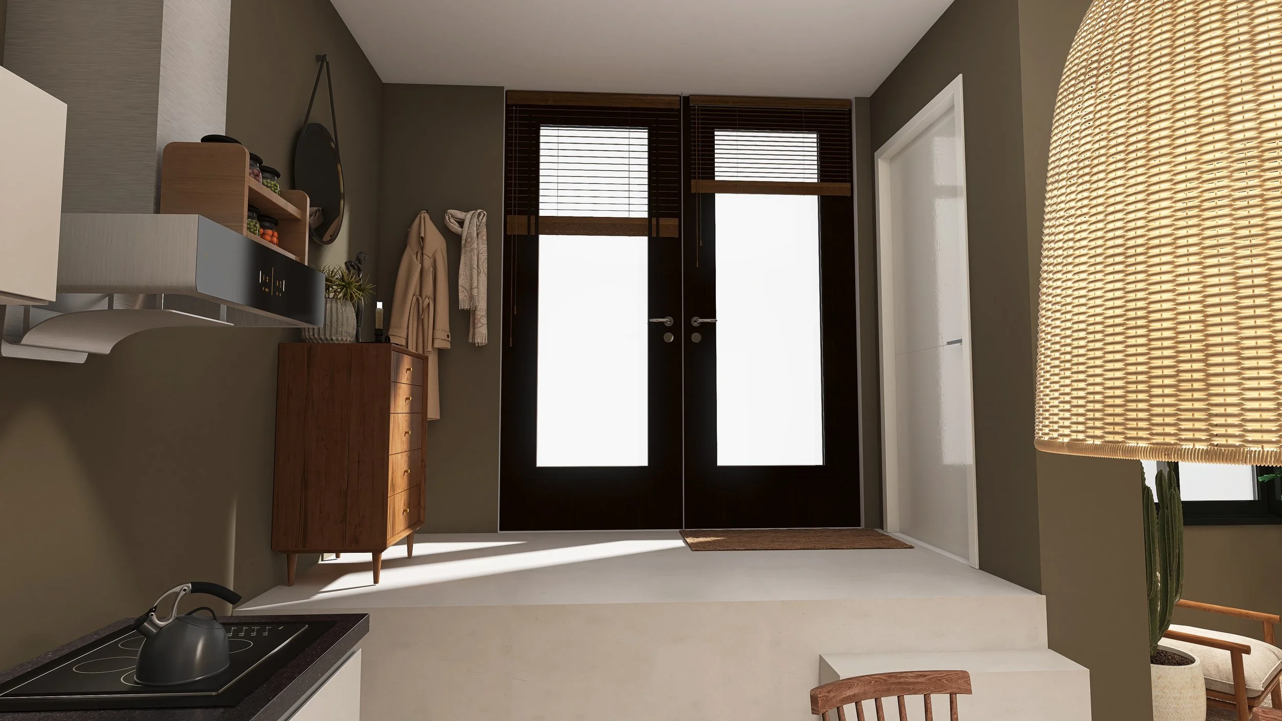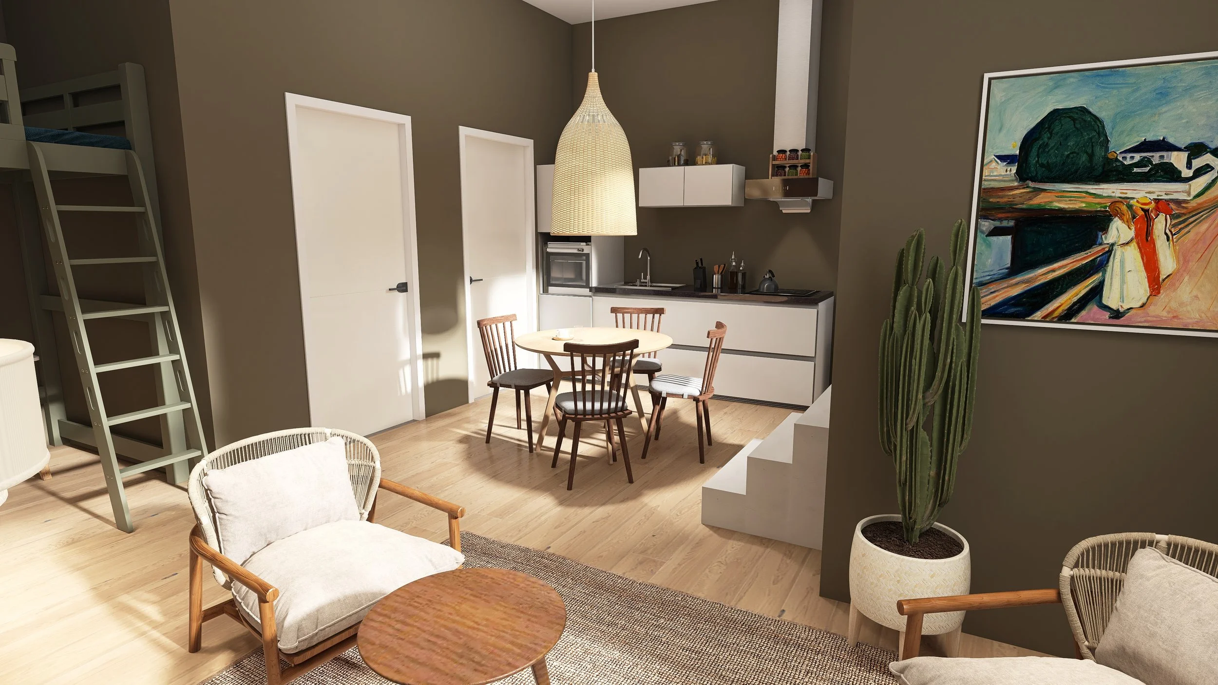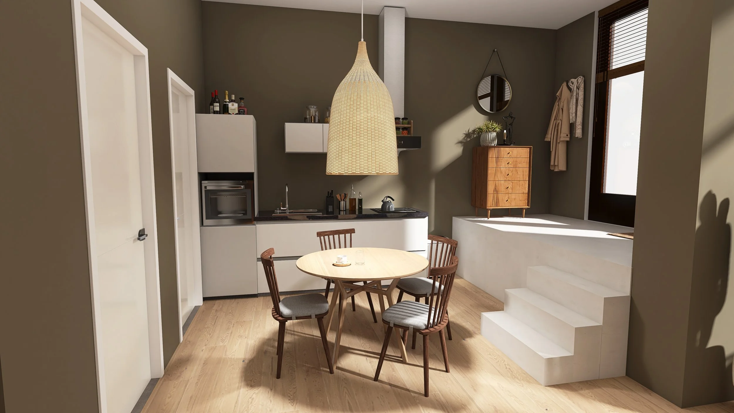Deze ruime studio bevindt zich op de begane grond van het complex. De voordeur is te bereiken via de eigen buitenruimte aan de Ds. Muntinglaan. Bij binnenkomst stap je op een verhoogd plateau. Via een trappetje kom je in de grote open ruimte terecht die door de hoge plafonds (ongeveer 3.50 meter) loft-achtig aanvoelt. In de studio is voldoende ruimte voor een aparte slaaphoek, eethoek en zithoek. De open keuken is voorzien van een inductiekookplaat, afzuigkap, koelkast en vaatwasmachine. Naast de keuken is er toegang tot de inbouwkast met daarin een aansluiting voor de wasmachine. Daarnaast zit de badkamer met douche, dubbele wastafel met spiegel en wc. Op de begane grond vind je ook de gezamenlijke berging. Deze studio heeft geen eigen parkeerplaats op het terrein.