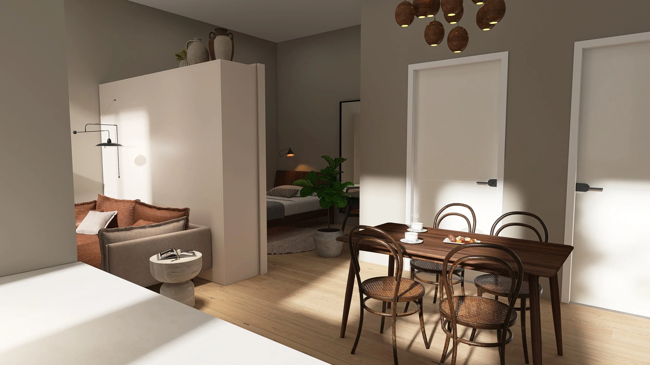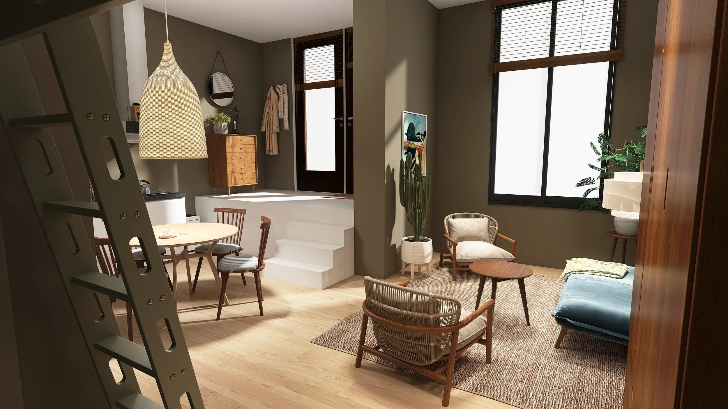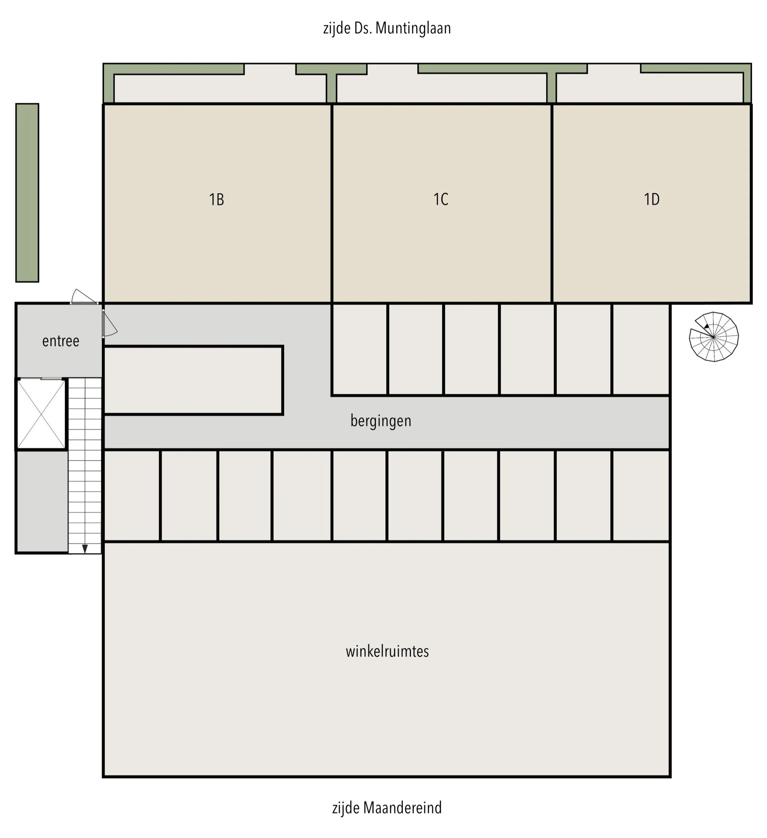 Via het parkeerterrein van het complex heb je toegang tot de drie studio’s: Studio 1B, 1C en 1D. Via de buitenruimtes van de studio’s kun je de woningen betreden.